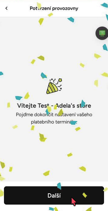 - Zkontrolujte název provozovny a klikněte na Další. Pokud máte pod emailem více společností, vyberte společnost, pro kterou chcete terminál aktivovat.