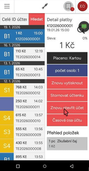 - V aplikaci Storyous otevřete Menu ≡ vlevo nahoře -> Přehled účtenek.